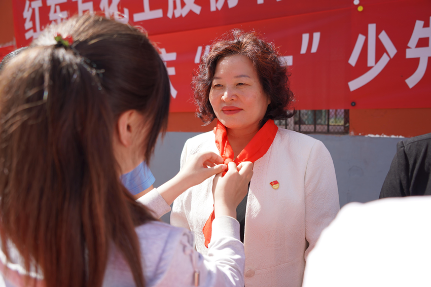 孩子們?yōu)楦魑活I導獻上鮮艷的紅領巾,于總勉勵孩子們要胸懷遠大理想,心懷祖國,感恩黨、感恩老師、感恩父母,刻苦學習文化知識,努力成為祖國和人民需要的棟梁之才,以優(yōu)異的成績回報親人、回報社會、回報祖國。